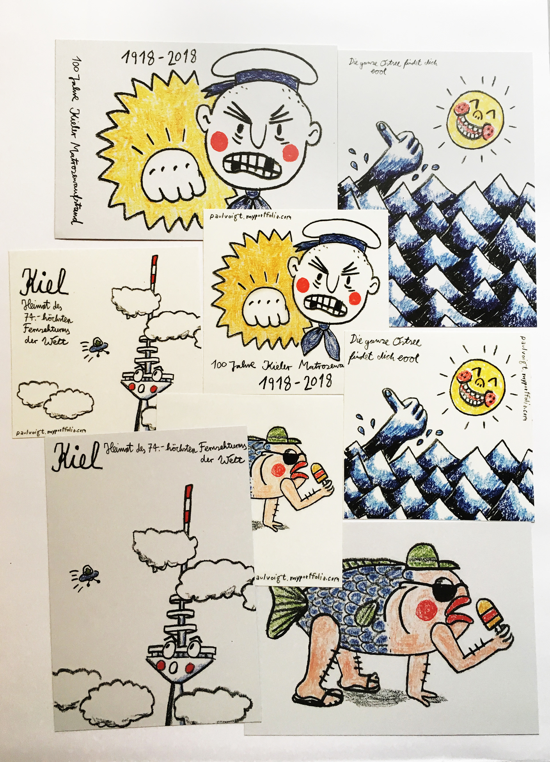 Postkarten und Sticker, die für die Kieler Woche angefertigt wurden. Erhältlich im Pressezentrum Schröder & Barcz, Weinhandlung Brunswik und dem Papierladen in der alten Mu. Oder einfach hier bestellen.